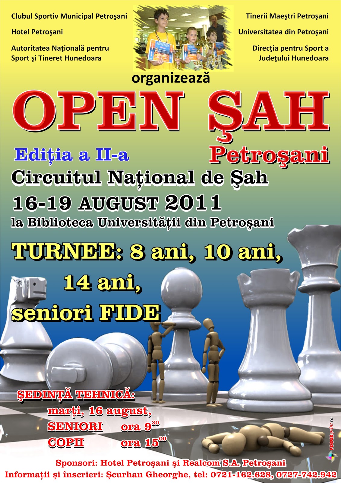 În cadrul Circuitului Naţional de Şah Clubul Sportiv Municipal Petroşani în colaborare cu ACS "Tinerii Maeştri" Petroşani şi Hotel Petroşani,cu sprijinul Federaţiei Romane de Şah,a Autorităţii Naţionale pentru Sport şi Tineret Hunedoara, Direcţia pentru Sport a Judeţului Hunedoara,Universitatea Petroşani şi SC Realcom SA Petroşani organizează în perioada 16 - 19 august 2011, la Biblioteca Universităţii din Petroşani,ediţia a II - a a concursului de şah " OPEN ŞAH PETROŞANI ",structurat pe categorii de varstă: Copii 8 ani,10 ani,12 ani,14 ani ,Turneul Debutanţilor şi Turneul Open General M + F.Turneele de Copii şi Juniori se vor desfăşura în sistem elveţian pe distanţa de 9 runde,cu un timp de joc de 61 de minute de jucător pentru toată partida.Competiţia de seniori se va desfăşura tot în sistem elveţian,pe distanţa de 7 runde,cu un timp de joc de 1 h 30 minute pentru 40 mutări + 30 minute KO / jucător.Competiţia de Copii şi Juniori se va raporta la Federaţia Romană de Şah pentru obţinerea normelor de clasificare